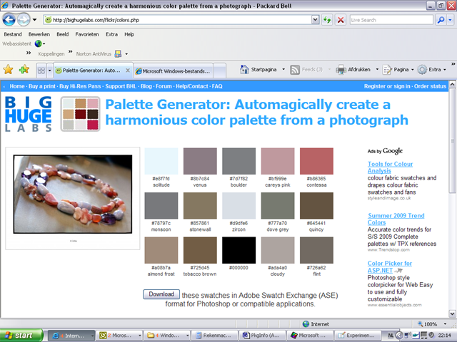 Via de blog van Veerle Maes ontdekte ik een tijdje geleden deze interessante site: Palette generator. Deze site suggereert telkens 15 kleuren bij de foto van jouw keuze. Het is heel eenvoudig: je uploadt een foto (bladeren…) , je drukt op het knopje, even wachten… en daar zijn de kleuren die bij de foto passen.