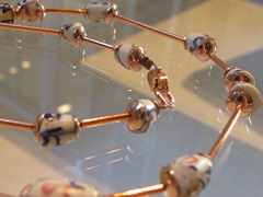 De kralen werden gemaakt rond 1850 in Venetië en zijn eigenlijk een imitatie van Delfts porselein. Het zijn zogenaamde “trade beads”, ze werden hoofdzakelijk gebruikt voor de ruilhandel met de Ibo, een stam in Nigeria. Ze werden geruild tegen palmolie.