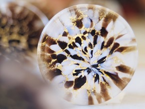 De basis is een platte ronde schijf van transparant glas, met een tekening in verschillende kleuren en bladgoud. (€10/stuk)