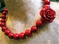 Een zuiver rood voor dit prachtige halssnoer in koraal. Roos en kralen in koraal, de lengte kan uiteraard aangepast worden.